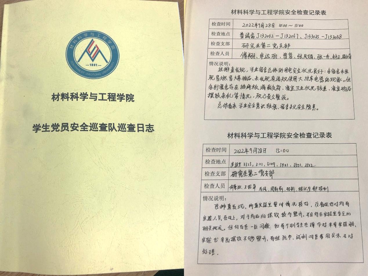 员工党员安全巡查队深入实验室。2022年9月28日,员工党员安全巡查队重点对九里校区3号楼实验室和员工工位区域的消防安全、化学安全、用电安全、环境卫生等多个方面进行了巡查,巡查结果登记于《员工党员安全巡查队巡查日志》。