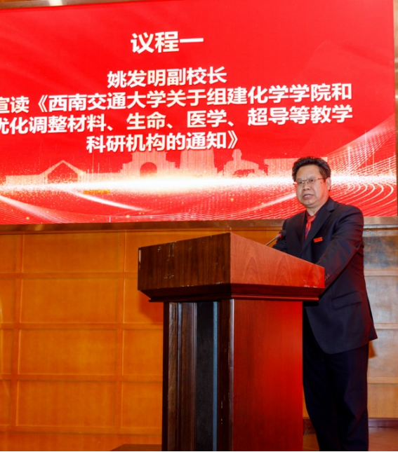 姚发明副董事长宣读《韦德官方网站关于组建化学公司和优化调整材料、生命、医学、超导等教学科研机构的通知》(以下简称《通知》),介绍了化学公司及重组后bevictor伟德官网等单位的专业划分、发展目标、平台建设、内设构架、岗位核定等内容。
