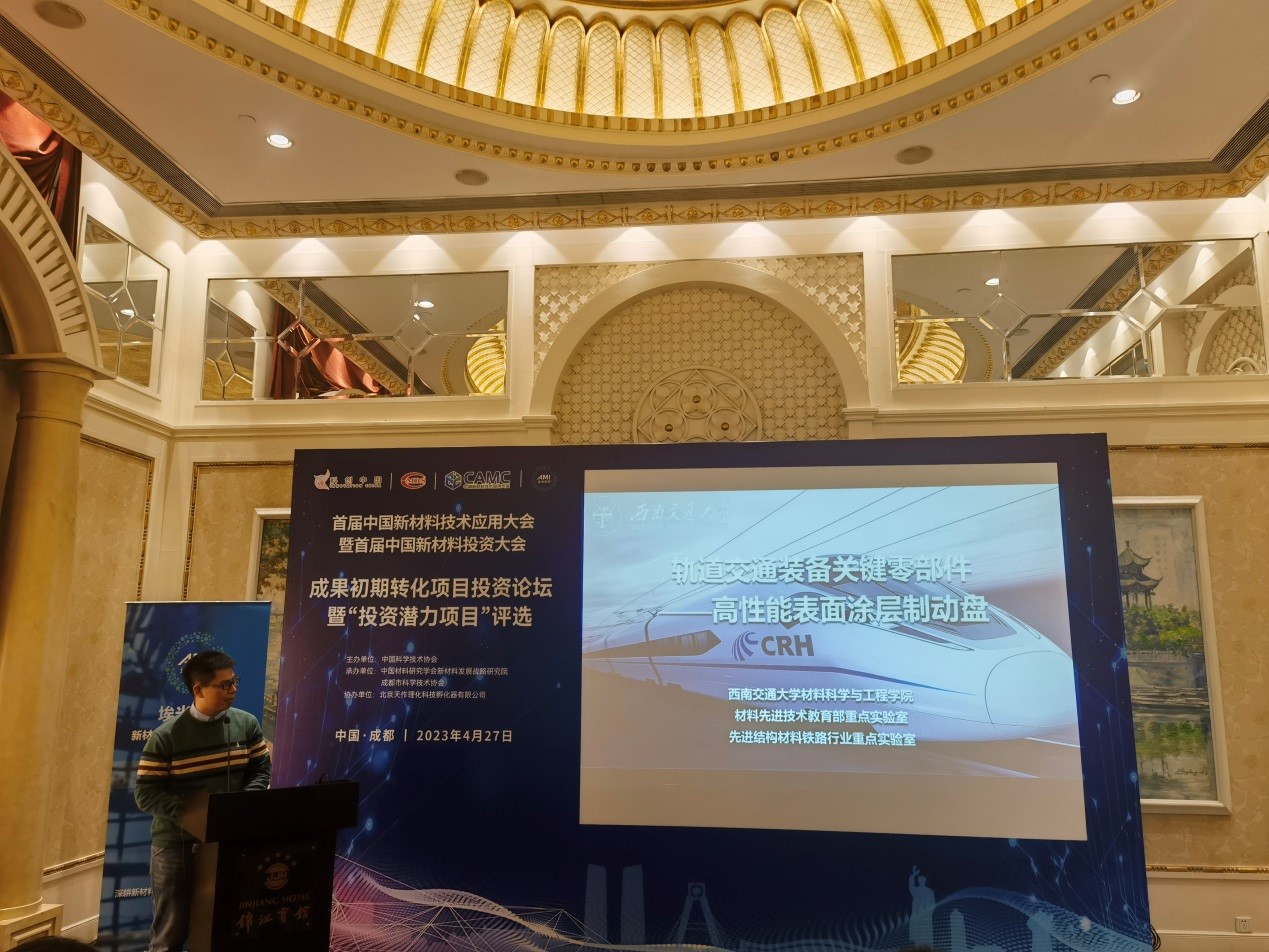 4 月 27 日,首届中国新材料技术应用大会暨首届中国新材料投资大会成果初期转化项目投资论坛在成都锦江宾馆召开,本次论坛由中国科学技术协会主办,北京天作理化科技孵化器有限公司协办。公司推荐的科技成果转化项目“轨道交通装备关键零部件高性能表面涂层制动盘”获大会颁发的“投资潜力项目奖”。
