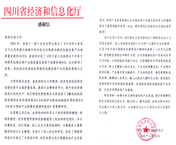 近些年,bevictor伟德官网金属材料系立足攀西钒钛稀土综合利用的国家战略,多次赴攀枝花、西昌和内江等地,深入企业开展现场调研,为国家和省市撰写了《非高炉冶炼钒钛磁铁矿调研报告》、《钒钛与钢铁产业统筹发展调研报告》、《攀西固废资源综合利用调研报告》。协助编写中国工程院《四川攀西优势资源综合利用及产业发展战略咨询报告》。参与《四川省先进材料产业“十四五”高质量发展路径研究报告》、《四川省推进钢铁行业“双碳”战略示范研究》等重大课题,为四川发展钒钛稀土新材料及先进制造提供政策建议。建议得到省委省政府、国家发改委批示,获四川省经济和信息化厅发文感谢,策划中国工程院战略研究与咨询(地方院重大)项目获批。
