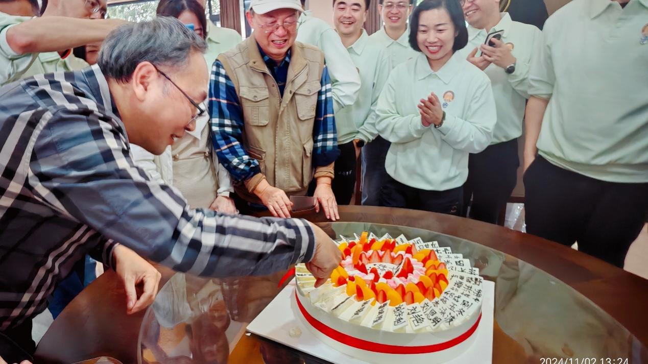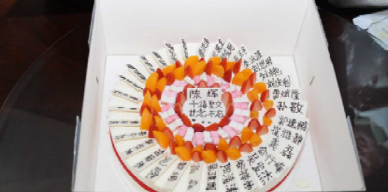 12:00,刚刚结束学术会议的公司经理陈辉教授来到现场,他代表公司党政班子热烈欢迎2000级员工回家,欢迎员工们为公司和公司发展建言献策。随后,他亲自为员工们切分写着每位聚会员工、老师名字的团聚蛋糕,活动在热烈的掌声中达到高潮。