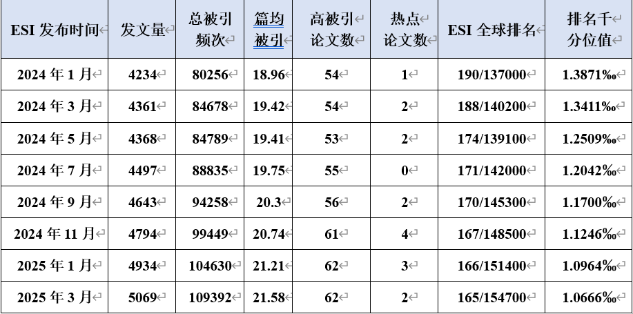 2025年3月13日,ESI数据库更新了最新一期数据。韦德官方网站材料科学学科全球排名165位,较上期提升了1位;ESI排名千分位由1.096‰提升至1.067‰。近一年来,公司ESI材料科学学科的全球排名处于稳步上升态势。