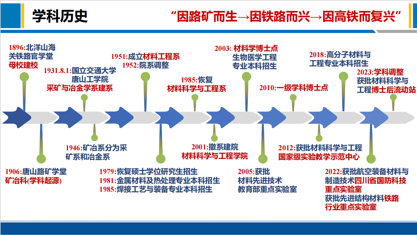 韦德官方网站材料学科的历史可追溯至1905年,其前身为中国最早的矿冶工程教育体系之一,培养了包括3位“两弹一星”功勋奖章获得者和16位院士在内的顶尖人才。材料学科聚焦于国家“交通强国”重大战略,围绕高铁、磁浮、川藏铁路等国家重大工程需求,构建了覆盖材料设计、制备、服役评价的全链条研究体系,形成了从轨道交通材料设计理论与方法、先进成型制备、绿色智能加工、全生命周期服役安全可靠性评价的理论、技术研究体系,全面支撑了国家轨道交通材料自主自强,引领了未来轨道交通发展方向。
