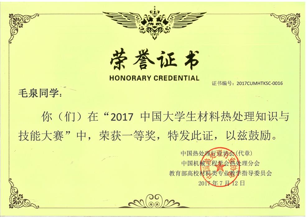 应中国热处理行业协会、中国机械工程学会热处理分会、哈尔滨工业大学的邀请,公司材料实验教学示范中心、金材系等负责组织了2017年“中国老员工材料热处理知识与技能大赛”西南赛区的培训和竞赛活动。共有26名同学参加了公司组织的竞赛培训,公司共有18位学子参赛,在张程菘、崔国栋、邓维礼等老师的积极组织和培训下,共获得2项全国一等奖和5项二等奖。