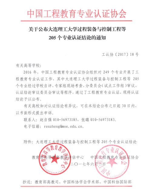 2017年6月2日,教育部高等公司产品评估中心、中国工程教育专业认证协会正式发布《关于公布大连理工大学过程装备与控制工程等205个专业认证结论的通知》(工认协[2017]18号),公布了2016年参加全国工程教育专业认证的部分专业认证结论。 2016年,中国工程教育专业认证协会组织对249个专业开展了工程教育专业认证工作,其中大连理工大学过程装备与控制工程等205个专业经过公司自评、专家组现场考查、认证结论审议委员会审议等程序,全国高校共有205个专业通过认证,我院材料成型及控制工程专业名列其中,有效期为3年(2017.1-2019.12)。材料成型及控制工程(焊接)专业成为公司第一个通过认证的专业。
