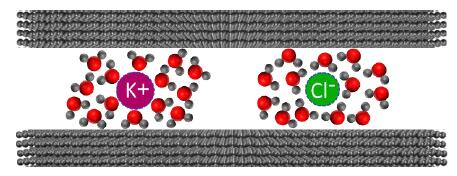 来自英国、中国的科研团队通过调控分子间范德华作用力,组装得到具有原子级别光滑表面的石墨烯通道,仅两层石墨烯厚度不同于准一维纳米管和生物通道,这种二维纳米通道化学稳定性良好,其高度洁净表面使得通道表面电荷密度较此前文献报道值低3-4个数量级,可以阻隔水合直径>13 Å的离子,这可以通过位阻效应予以解释。研究还发现,对于水合直径分布在6.6-12.5Å之间的常见金属离子,虽然水合离子直径依然大于通道尺寸,但该通道却允许这些离子以不同的速率通过。文章的研究结果还显示,水合离子在此类二维原子级受限空间传输时,表现出柔软球体的特性,可以通过挤压或平滑水合层的方式穿过该通道。进一步对不同阳离子氯化盐的漂移-扩散研究,发现尺寸相当的阴阳离子(和) 却在该通道中表现出不对称的迁移速率,可以通过离子外水合层的不同排布方式进行解释(如下图所示)。