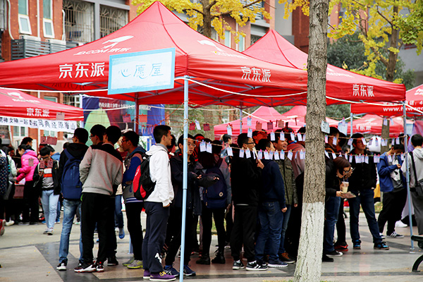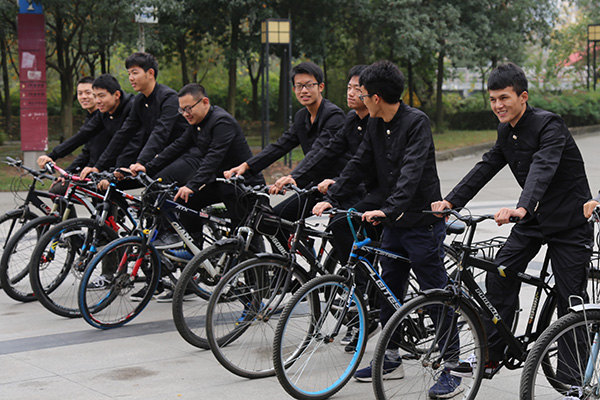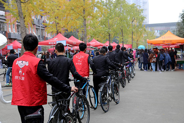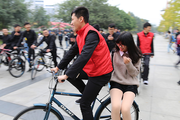 天空中的蒙蒙微雨丝毫没有浇灭女生节现场如火的热情,二教前身着黑色中山装的“自行车骑士”早已整装待发,等着护送女生们前往女生节现场开启女生节4.0第一天的精彩。