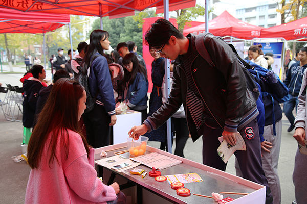 现场一共有六个游戏区:忆往昔峥嵘岁月的“似水流年”活动,在电脑上播放着儿时的动画片片段,让参与者们猜出片名怀想过往岁月;唤起昨日记忆的“岁月如歌”活动,播放着一首首歌曲前奏,依旧让参与者猜歌名、共开心;重温旧梦的“雏鹰起飞”连踢毽子活动,适时地令参与者想起了曾经的青梅竹马;时尚接地气的“你花我猜”猜化妆品价格活动,更是引起了男男女女的好奇,女生们问猜对了能送给她吗,男生们就不禁明白了为什么女生花钱如流水了;考验默契的“指尖印象”活动要求两个人一组各出一只手来翻绳,真是一个闺蜜、情侣加深感情的好机会呢;而考验灵敏的“蜕变个球”活动要求参与者用筷子夹乒乓球,参与者都玩得不亦乐乎。每个游戏完胜都可以集印章,到领奖处会有不同的礼品可以兑换。