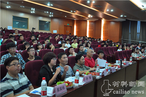 在短暂的开场视频后,8位参赛选手依次上台进行作品展示及答辩。首先上场的是1号选手汪丹妮,她设计的院徽整体色调为绿色,体现了“材料”和“环保”的基点,主体部分为不同字体的“材”和“料”组合而成的字,意在表达“新材料”和一种敢于创新的精神。第二名选手黄行达的院徽则以蓝色为主,代表了交大蓝以及材料的未来。六边形框架中内嵌着碳原子骨架,就像显微镜下做科研的感觉,体现了工程与材料的关系。面对各位老师的提问,黄行达机智幽默的回答也使得现场气氛更加轻松愉快。