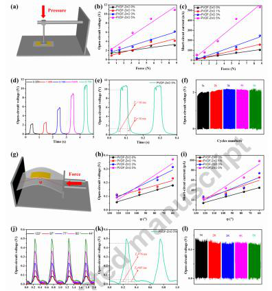 图3. 设计的PES的电气特性。(a) 压力模型下PES的测量示意图。0.35 N ~ 8.75 N不同力下PES的开路电压(b)和短路电流(c)的关系。(d) 不同作用力下一周期开路电压的放大图。(e) 压力模型中PES的升降次数。(f) 压力为4.67 kPa的重复加压/减压条件下的PES在5000次循环下的力学耐久性试验。(g) 显示弯曲模型下PES测量的示意图。不同的角度(φ)范围从122°到44°,PES的开路电压(h) 和短路电流 (i) 关系。(j) 不同角度下增加开路电压。(k) 弯曲模型中的PES的上升/下降时间。(l) 角度为97°持续5000次循环重复弯曲/不弯曲条件下,PES的机械耐久性试验。