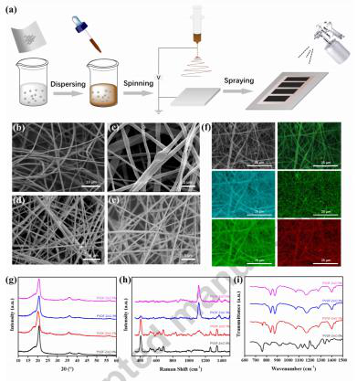 图2. PES的CPZN的表征。(a) PVDF/ZnO柔性传感器制造过程。PVDF/ZnO中 ZnO含量为(b)0wt%,(c) 1wt%,(d) 3wt%,(e) PVDF/ZnO 5wt%的SEM图像。(f) PVDF/ZnO NFs的元素分布图。(g) PVDF/ZnO NF的XRD图。(h) PVDF/ZnO NFs的拉曼光谱。(i) PVDF/ZnO NF的FTIR光谱。