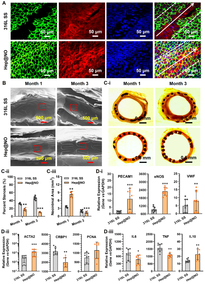 然而,由于血管支架表面缺乏固定NO和肝素的反应性基团,而现有的技术也存在难以实现支架表面NO和肝素引入量和生物活性保持力的统一,限制其在模仿内皮功能上的发挥。为了打破技术瓶颈上的壁垒,黄楠/杨志禄教授采用自主开发的“金属-酚-(胺)”表面涂层技术,通过逐步修饰策略,实现了血管支架表面基于NO和肝素协同修饰的内皮功能仿生设计。基于“金属-酚-(胺)”表面涂层改性技术在血管支架表面构建的CuII-DA/HD纳米涂层,不仅赋予了血管支架长期、持续、稳定及可控NO催化释放能力,且表面引入的丰富反应性基团氨基实现了高密度的肝素共价固定,固定的肝素保持了高度的生物活性(图3)。通过优化NO和肝素的修饰计量,实现了血管支架内皮功能仿生的最优化设计。该技术构建的内皮功能仿生涂层应用于支架表面改性,赋予了支架优异的抗血栓、调控炎症、促进内皮再生和抑制支架再狭窄的能力(图4),为发展具有病灶治愈和血管组织修复功能的新一代血管支架提供了极其宝贵的思路、指导及奠定了坚实的基础。
