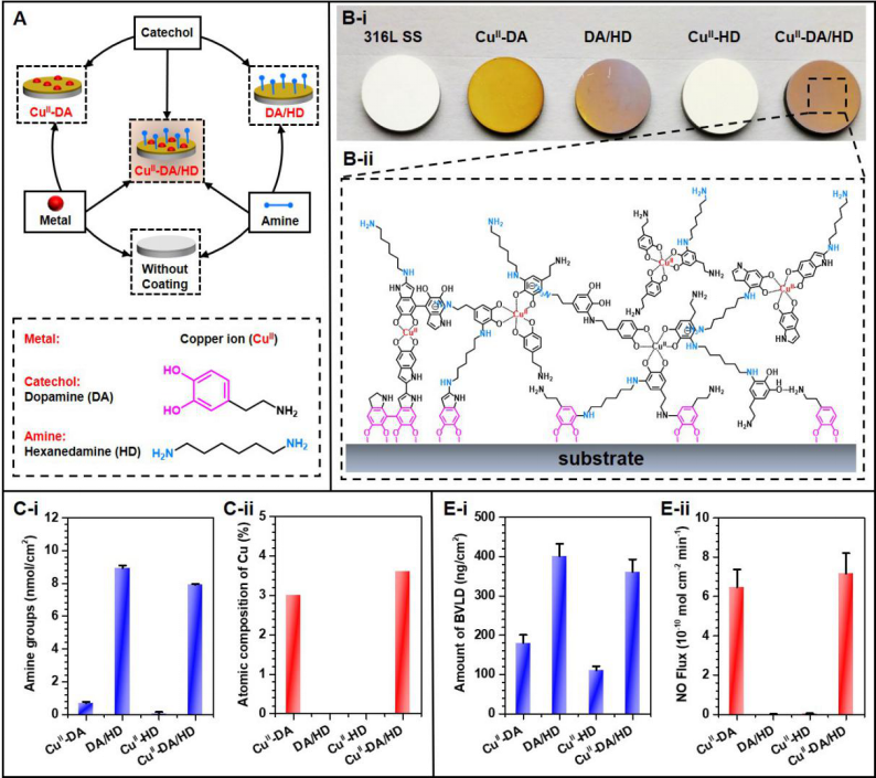 图2.“金属-酚(胺)”表面化学构建具有NO催化活性及丰富氨基官能团粘附涂层。