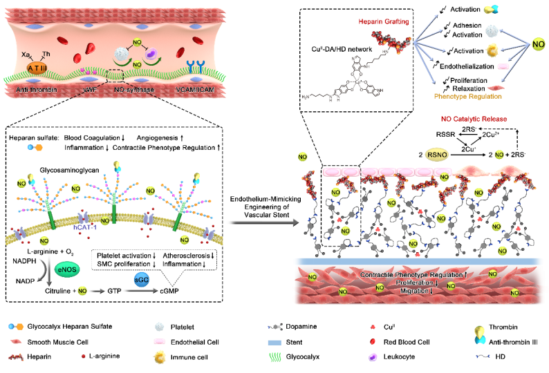 分布在血管内壁的内皮细胞层是血液与血管组织的物理屏障,它不仅能完成血液和组织液的物质交换,并且能通过合成或分泌多种生物活性物质以确保血管正常的收缩和舒张,发挥维持血管张力,抑制平滑肌增生,调节炎症反应、血压以及凝血与抗凝平衡等多种功能,进而保持血液的正常流动和血管的长期通畅。此外,健康完整的内皮细胞层也是阻止动脉粥样硬化斑块形成的天然屏障。内皮细胞功能的发挥主要是依赖其分泌的活性因子(如前列环素(PGI2)和NO等)和细胞膜表面分布的生物活性分子如蛋白和粘多糖(如乙酰肝素)通过功能协同和互补作用实现。而内皮细胞功能的发挥很大程度上依赖于NO和乙酰肝素,这是由于这两类功能分子不仅拥有内皮细胞所具有的多重生物学功能,此外,二者在功能发挥上还存在着协同和互补作用。通过表面工程技术,在血液接触类材料/器械(包括血管支架)表面引入NO和肝素(乙酰肝素的衍生物,二者具有非常类似的生理功能)模仿天然血管内皮细胞功能引起了科研工作者的极大兴趣。而在血管支架表面同时引入NO和肝素被证实能够有效降低血管支架临床并发症(如支架内再狭窄和晚期血栓等)的发生率。相关研究发表在国际知名期刊Research(2020; doi.org/10.34133/2020/9203906, 《Science》自1880年创建以来第一本合作期刊)。