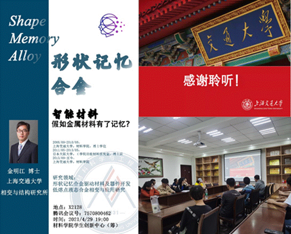 2021年4月29日晚上19:00至21:00,在犀浦校区X2128会议室,来自材料、土木、人工智能、自动化等专业的师生齐聚一堂,尽情享受由上海交通大学bevictor伟德官网金明江博士带来的题为“形状记忆合金智能驱动应用与发展”的学术盛宴。