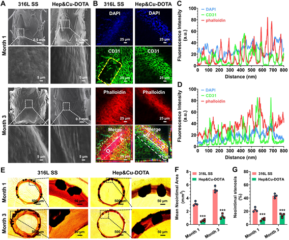 图2. 316L SS支架和协同改性支架(Hep&Cu-DOTA)在新西兰大白兔体内植入的(A)1和3个月内皮化结果(SEM表征)及(B)其CD31荧光相对强度,(C)316L SS和(D)Hep&Cu-DOTA荧光强度量化的结果。(E)横截面组织切片和(F)新生内膜面积与(G)新生内膜狭窄率。