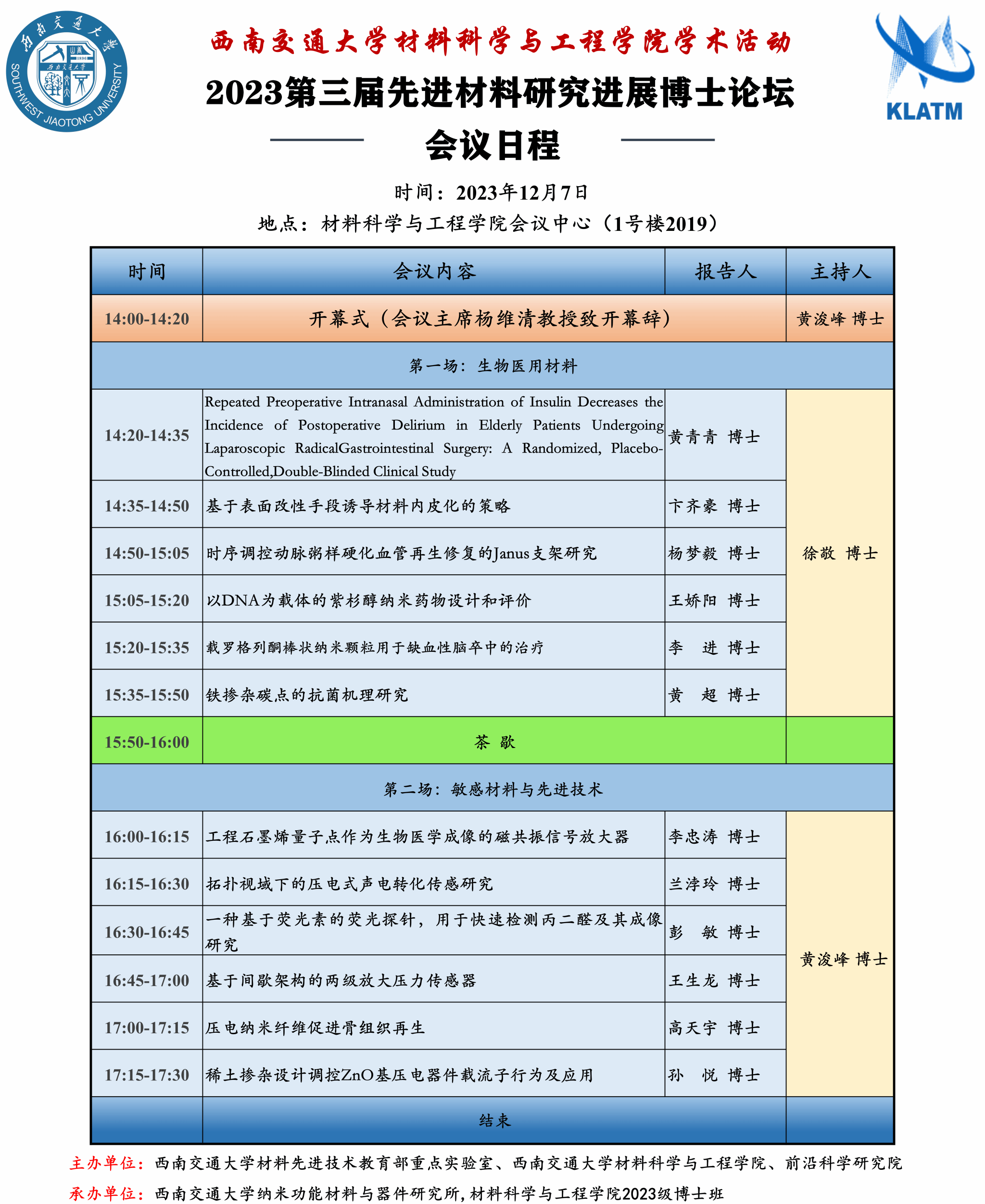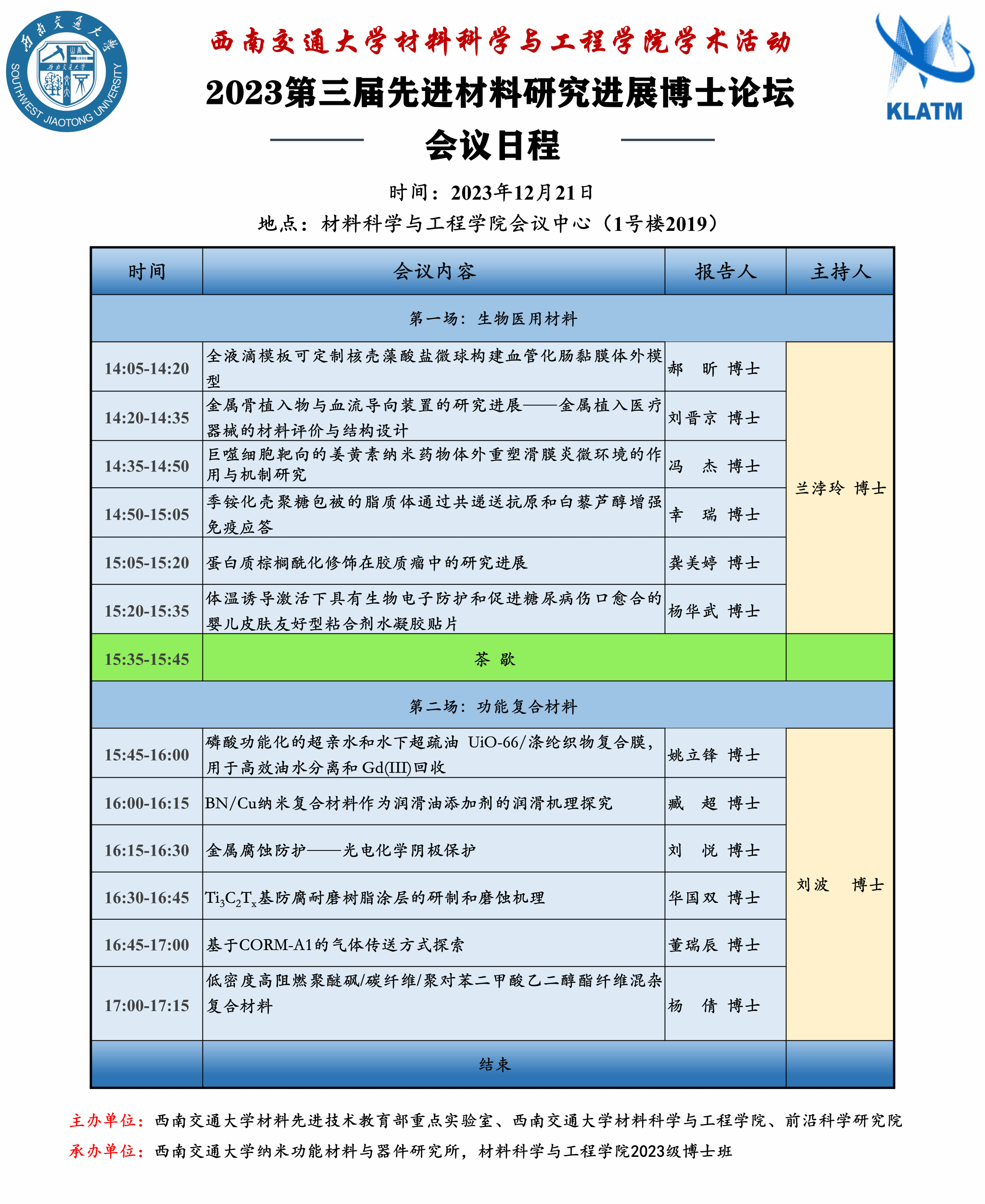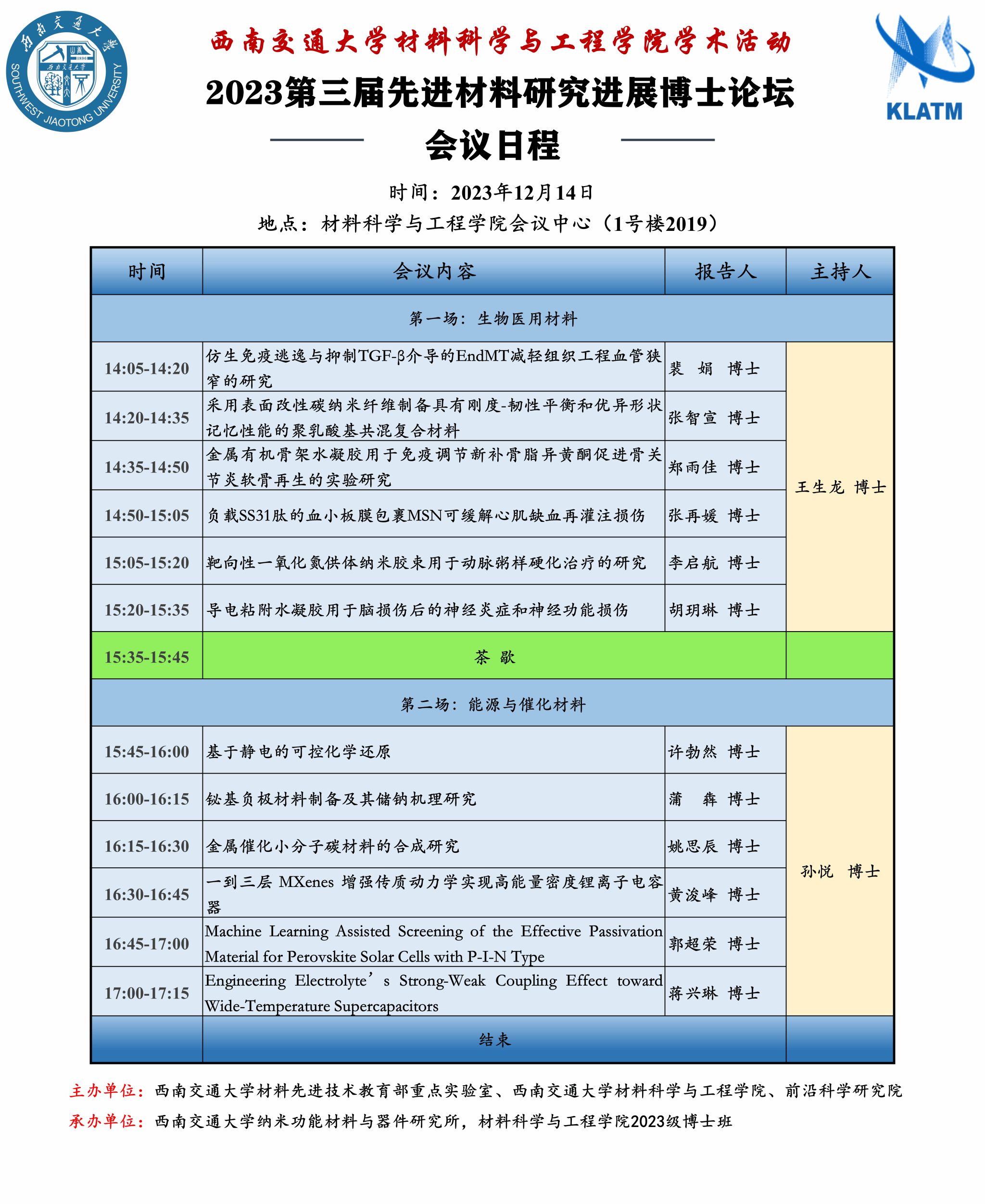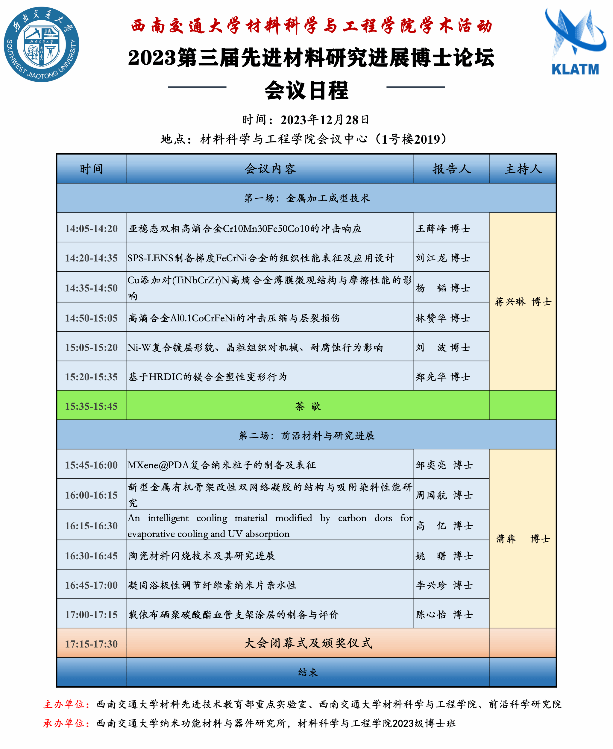 先进材料的研究对于培育经济发展新动能、获取未来竞争新优势等方面具有重大意义。新材料技术是高新技术的物质基础,为主动服务于国家发展新材料的重要战略定位,集中力量推进关键核心技术的攻关和产业创新;推进材料研究向“能源+材料”“基础+高端”方向发展,将于2023年12月7日,12月14日,12月21日,12月28号举办bevictor伟德官网学术活动——2023第三届先进材料研究进展博士论坛。本次论坛分为生物医用材料,敏感材料与先进技术,能源与催化材料,功能复合材料,金属加工成型技术以及前沿材料及研究进展等六个分会场,涵盖了先进材料研究前沿的48个方向,并由2023级博士进行主题报告。希望借举行此次博士论坛的契机,为材料科研工作者提供研究工作交流的平台,吸引更多先进材料领域的老师进行指导,开启更深层次的创新合作。