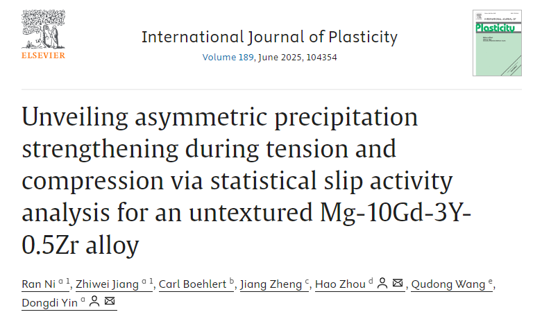 近日,公司尹冬弟教授、博士生倪然等在无织构、无孪晶的析出强化型镁合金(Mg-10Gd-3Y-0.5Zr)中,首次发现了析出强化效果在拉伸与压缩加载下存在显著差异,即析出强化的拉压不对称性。通过系统分析晶粒尺度滑移活性、原子尺度位错-析出相交互作用,结合CRSS的定量计算,揭示了其微观机制。此研究提醒我们在研究镁合金时效强化时必须要考虑其加载方向,为全面理解和调控镁合金析出强化提供新见解。相关工作以“Unveiling asymmetric precipitation strengthening during tension and compression via statistical slip activity analysis for an untextured Mg-10Gd-3Y-0.5Zr alloy”为题发表在金属材料和固体力学领域高水平期刊International Journal of Plasticity。论文主要合作者还包括辽宁材料实验室周浩、密歇根州立大学Carl Boehlert、重庆大学郑江、上海交通大学王渠东等。
