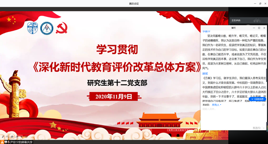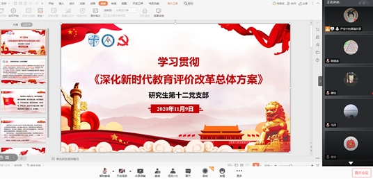 2020年11月9日晚21时15分,bevictor伟德官网研究生第十二党支部在腾讯会议组织支部党员学习讨论由中共中央、国务院印发的《深化新时代教育评价改革总体方案》(以下简称《方案》),本次学习活动由支部书记尹佳宁同志主持。