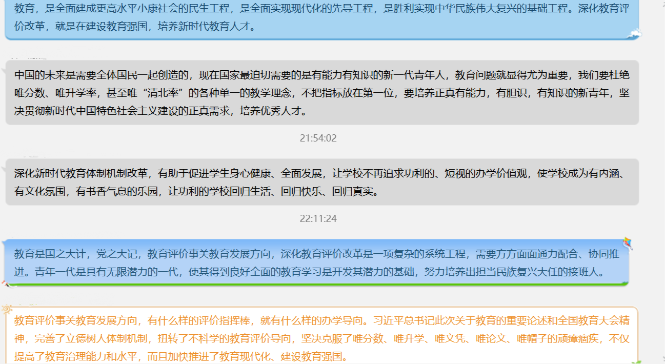 最后,其他支部成员也都在线上相继发表了自己的学习心得体会。通过本次学习讨论,支部成员们都深刻的体会到了教育是国之大计,教育评价事关教育发展方向。至此,本次主题党日活动顺利结束。