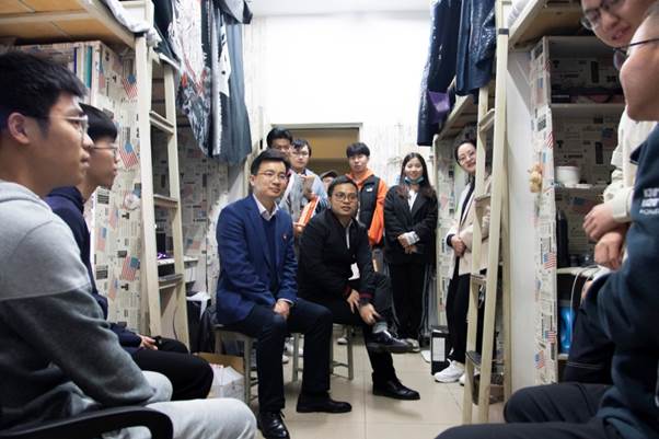 陈勇书记在宿舍内和同学们进行了亲切的座谈和交流。陈书记告诉临近毕业的2017级同学们:想要适应离开大学后的社会生活,必须有不怕吃苦和不怕吃亏的精神;要以换位思考的方式反思自己的不足,从而不断提高工作水平;在工作中不要放过任何一个细节;想做的事情一定要努力去做;要注重培养自己的公文写作能力……