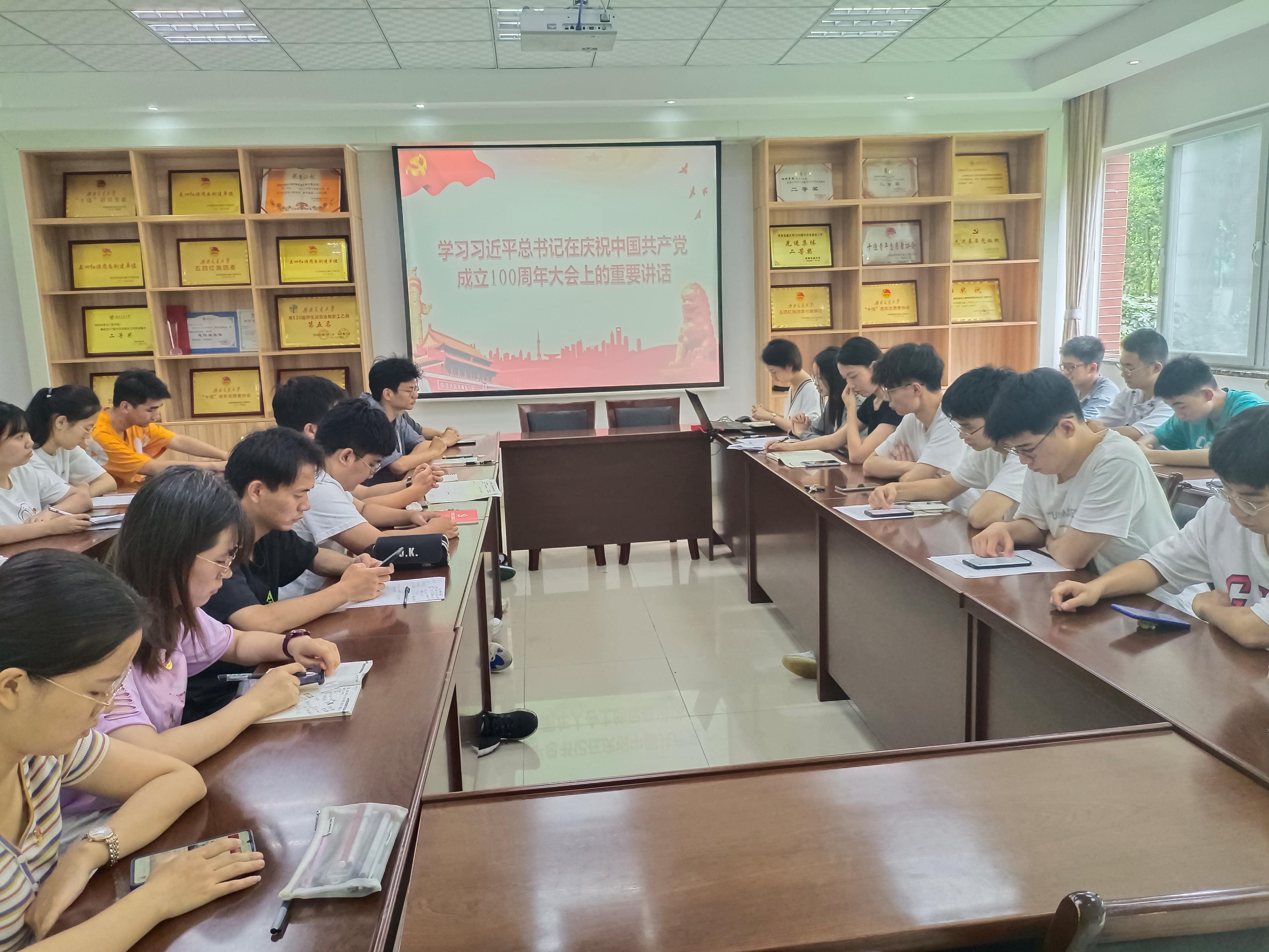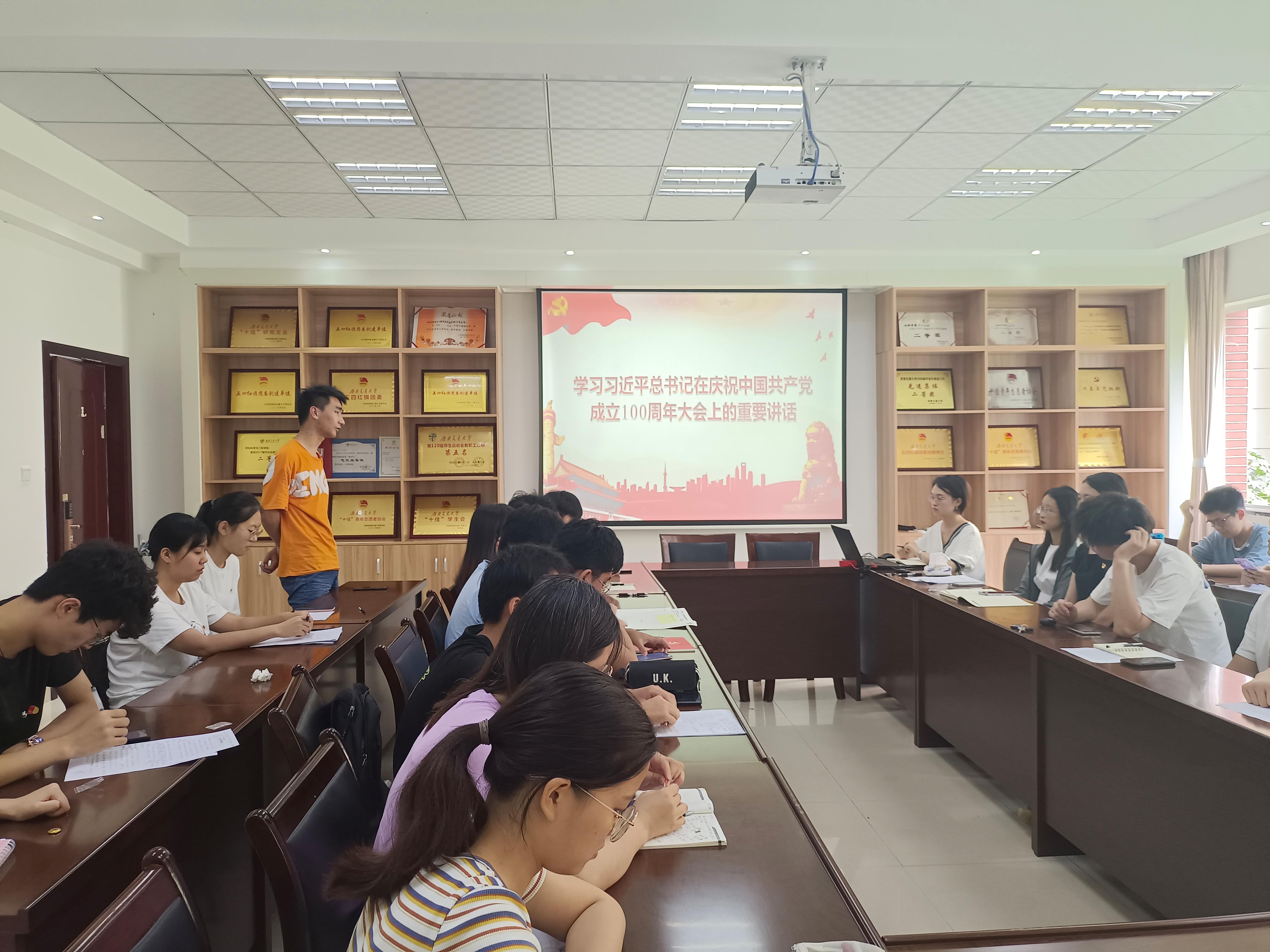 2021年7月1日,本科生第一(2019级)党支部在x2128召开党史学习教育专题组织生活会,学习习近平总书记在庆祝中国共产党成立100周年大会上的讲话精神。参加本次活动的有支部书记熊苏雅,党员邓文婷、董海霞,以及支部全体预备党员。