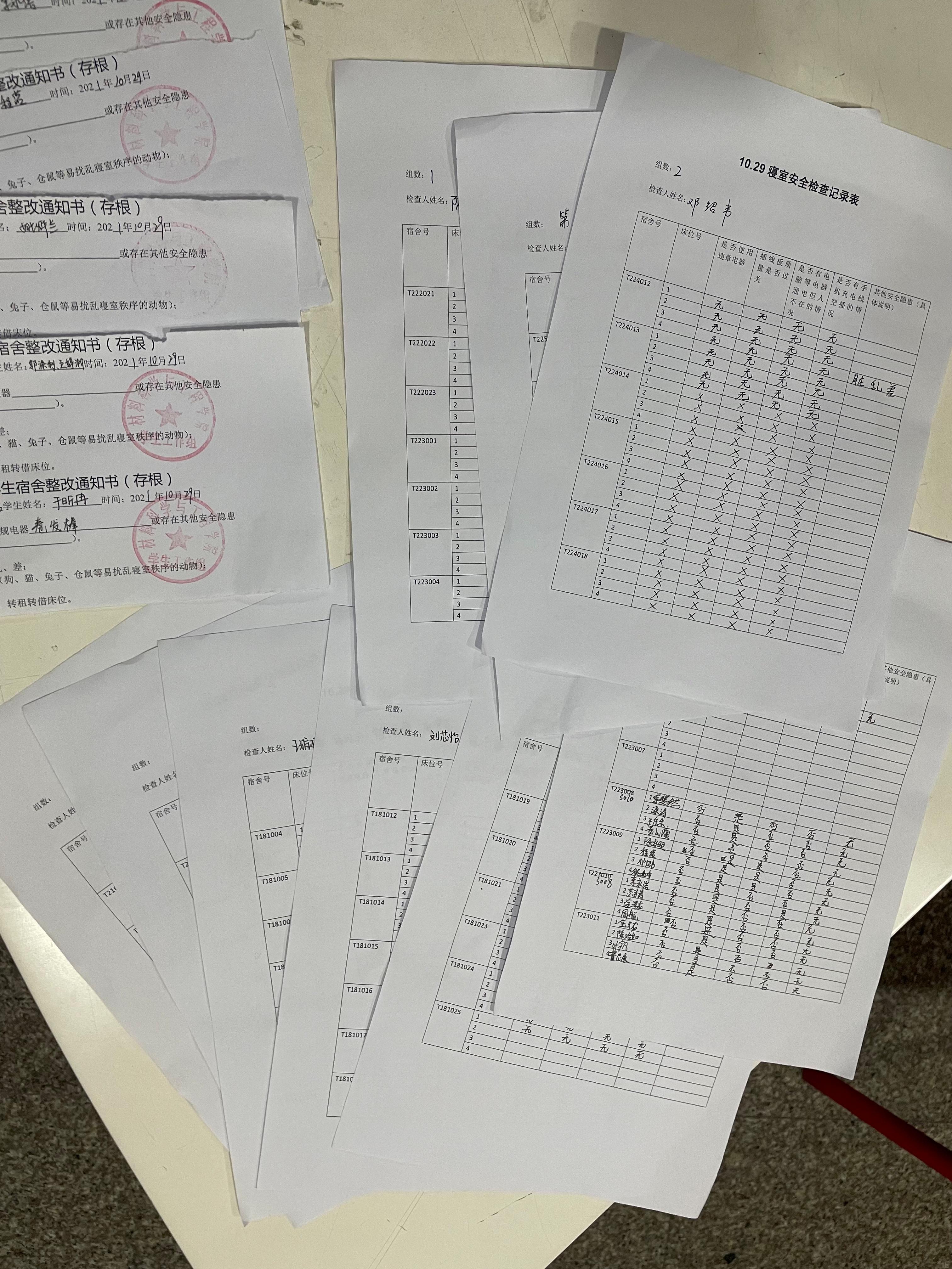 所有参与查寝的同志共分为三组,分别对天佑斋18栋、20栋、21栋的宿舍进行了检查。首先检查宿舍卫生,提醒同学们冬季多开窗通风换气,随后就宿舍成员是否使用大功率电器、违章电器,是否使用三无电器产品,是否危险用电等方面进行了细致地排查。在排查过程中,同志们发现部分宿舍存在插头空插、私拉乱接等安全隐患,责令同学们立即整改,避免以后再出现危险用电情况,同时在宿舍安全检查登记表上作了详细记录,并对员工下发整改通知。