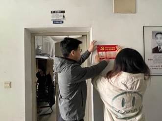 本科生第一党支部书记熊苏雅,第二党支部书记郑纪伟,辅导员邓文婷,员工党员张斯涵、于睿智、颜阳、王晓婷等同志,前往园区为员工党员挂牌。熊苏雅和郑纪伟老师提醒党员同志要牢记入党初心,做好老师与员工之间沟通的桥梁作用,用实际行动践行服务集体。前来挂牌的师生还为新同志佩戴党徽。