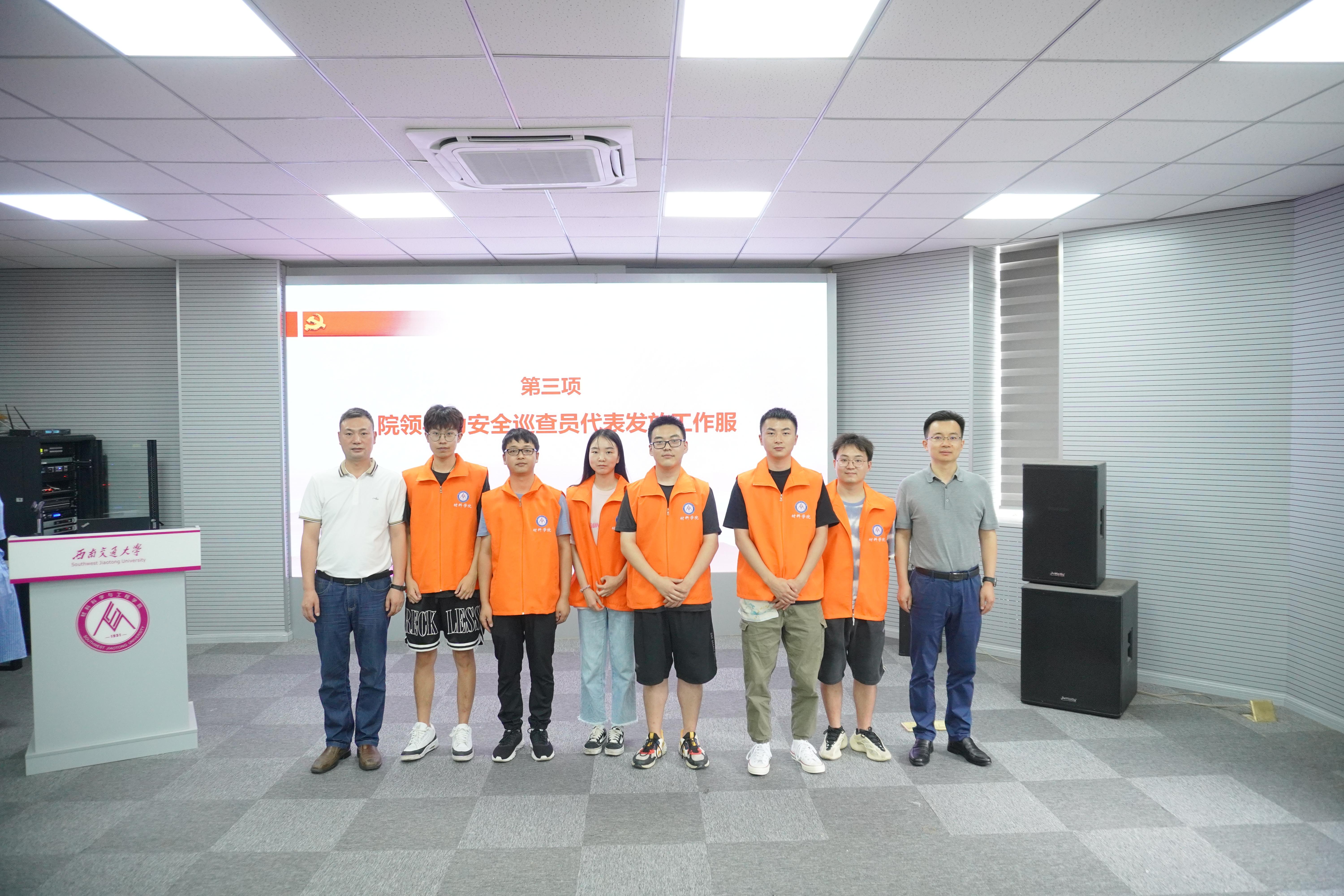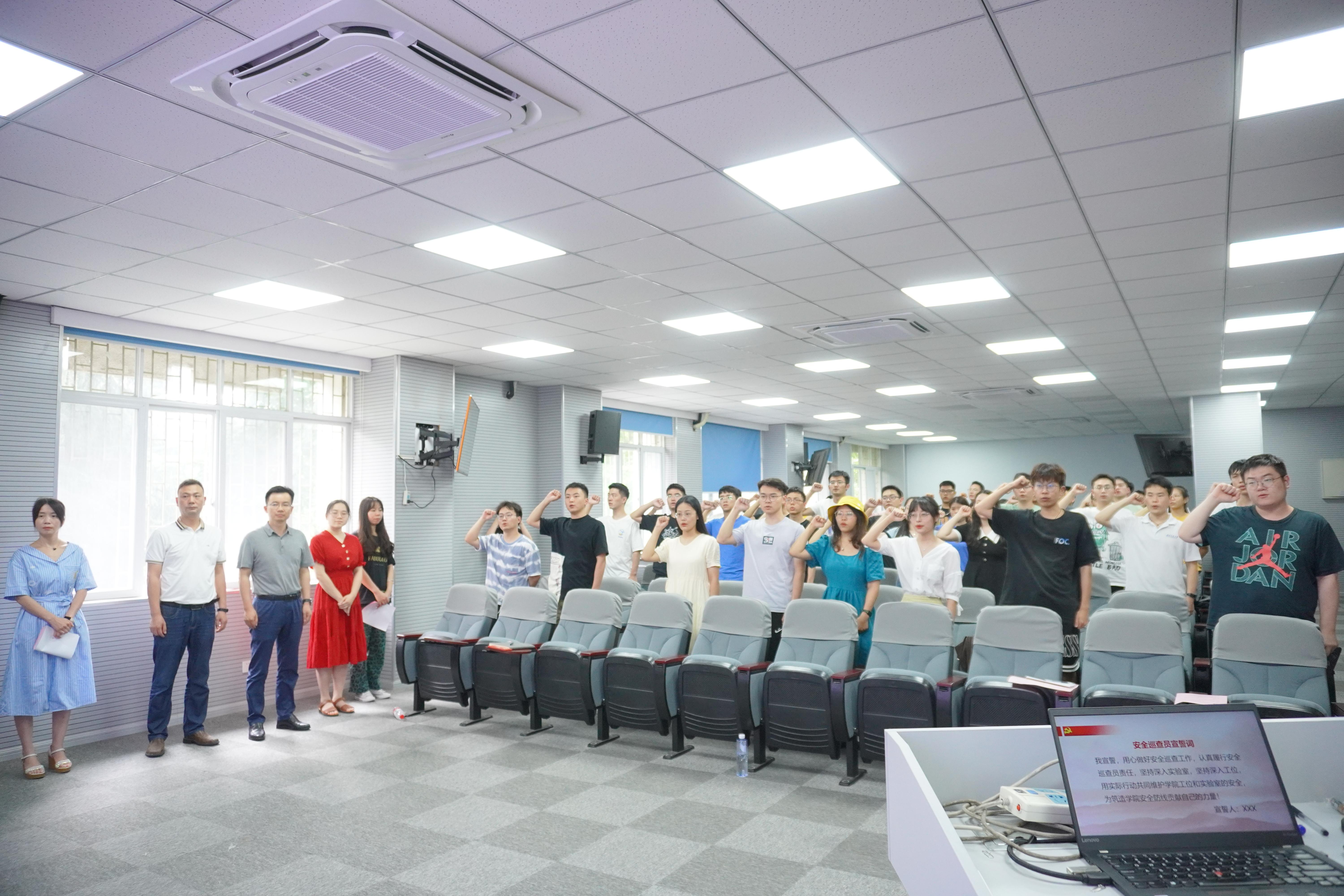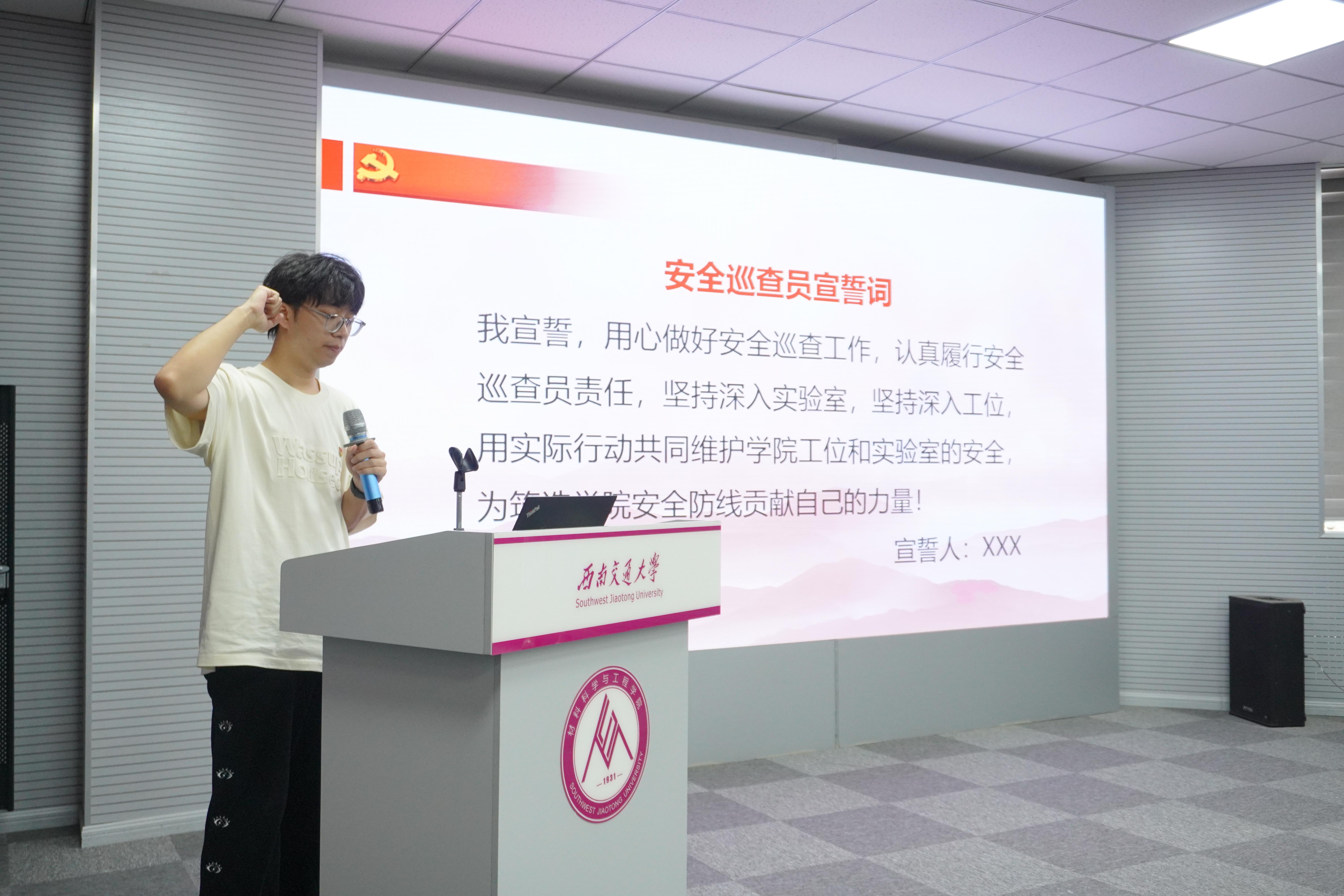 随后,全体安全巡查员宣誓。在宣誓环节,与会同学们满怀热情,由员工代表张旭龙领誓,员工巡查队成员全体宣誓:保证必将用心做好安全巡查工作,认真履行安全巡查员责任,坚持深入实验室,坚持深入工位,用实际行动共同维护公司工位和实验室的安全,为筑牢公司安全防线贡献自己的力量。宣誓完毕后,院领导为安全巡查员代表发放工作服,对同学们的积极参与表示高度赞扬并给予深切嘱托。