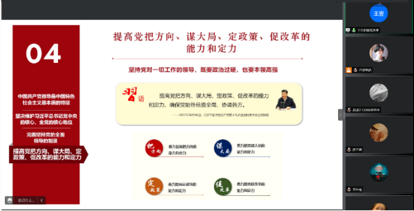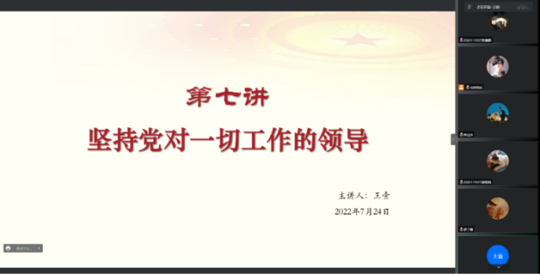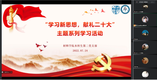 2022年7月24日19:30,bevictor伟德官网本科生第二党支部“学习新思想,献礼二十大”主题系列学习活动第4期(第7讲)在线上平台如期举行。建筑公司员工党建工作负责人、2022级本科新生辅导员袁毓璟老师,公司本科生第二党支部书记、2020级辅导员郑纪伟老师和支部新发展党员参加本次学习会。材料(金属)2020-02班冉梁雨优同志主持。