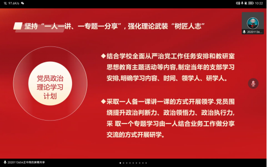 为更好发挥员工党支部和员工党员在高校人才培养、员工日常管理服务工作中的战斗堡垒作用和先锋模范作用,探索创新党建工作方法,推动公司员工党建工作再上新台阶,在委的统一部署下,由本科生第二党支部牵头、本科生第四、第五党支部联合开展的《四川省高校“优秀支部工作法”》专题学习研讨会, 于2022年9月25日上午在线上平台举行。