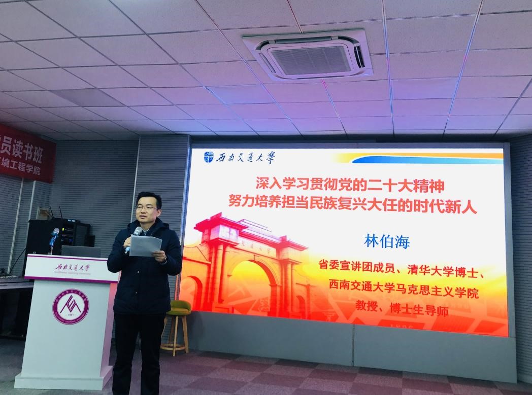 2022年12月2日下午,委在九里校区J3324会议室举行党的二十大精神专题学习。四川省宣讲团成员、著名专家、公司马克思主义公司原经理林伯海教授应邀作《深入学习贯彻党的二十大精神 努力培养担当民族复兴大任的时代新人》专题报告。公司党委书记陈勇、经理朱旻昊以及九里校区师生党员共计200余人参加,陈勇主持。