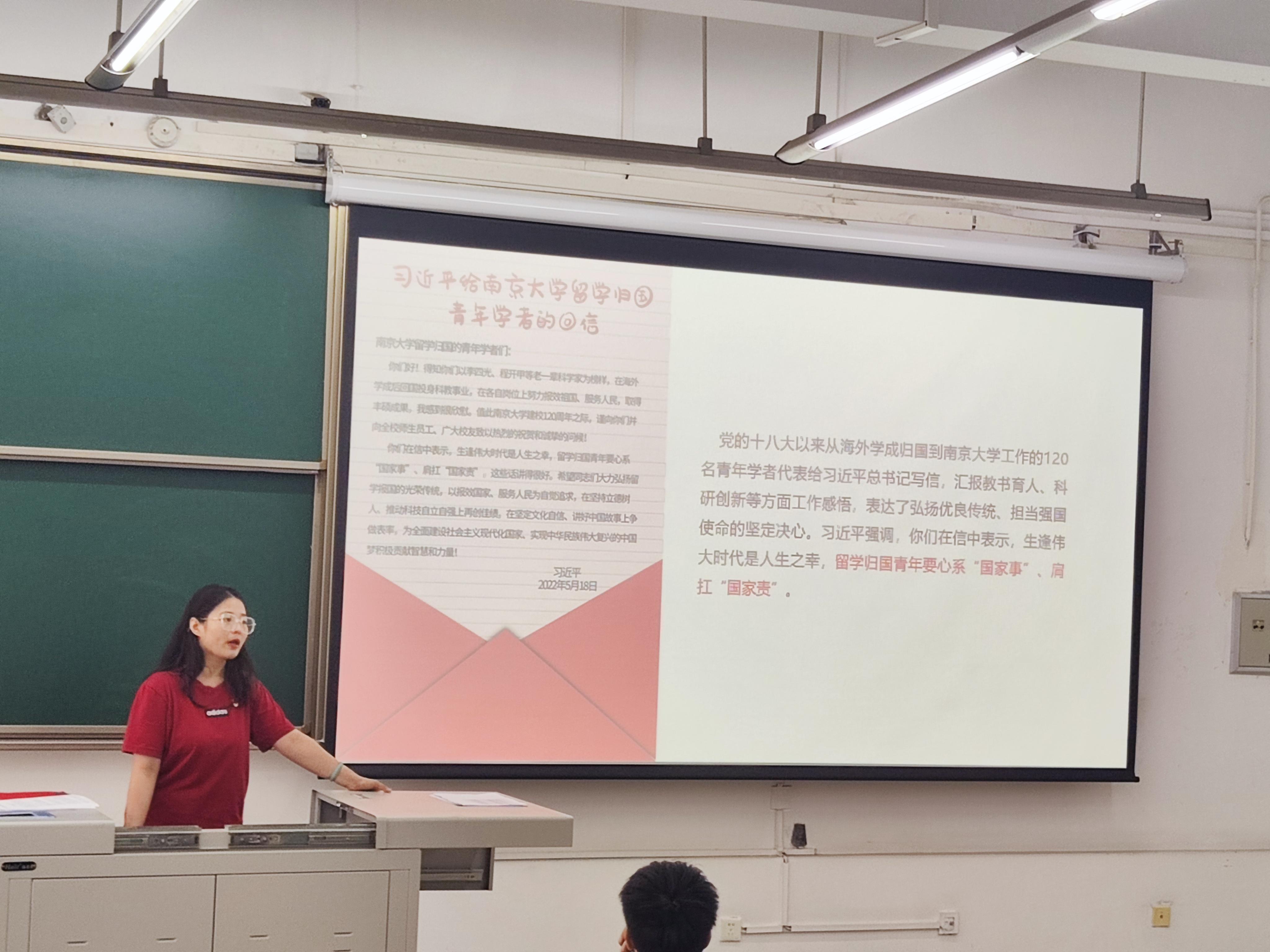 首先,王誉静同志带领大家学习了习近平总书记给南京大学留学归国青年学者以及给南开大学8名新入伍老员工的回信,勉励同志们要心系“国家事”,肩扛“国家责”,把爱国之心化为报国之行,书写绚烂、无悔的青春篇章。