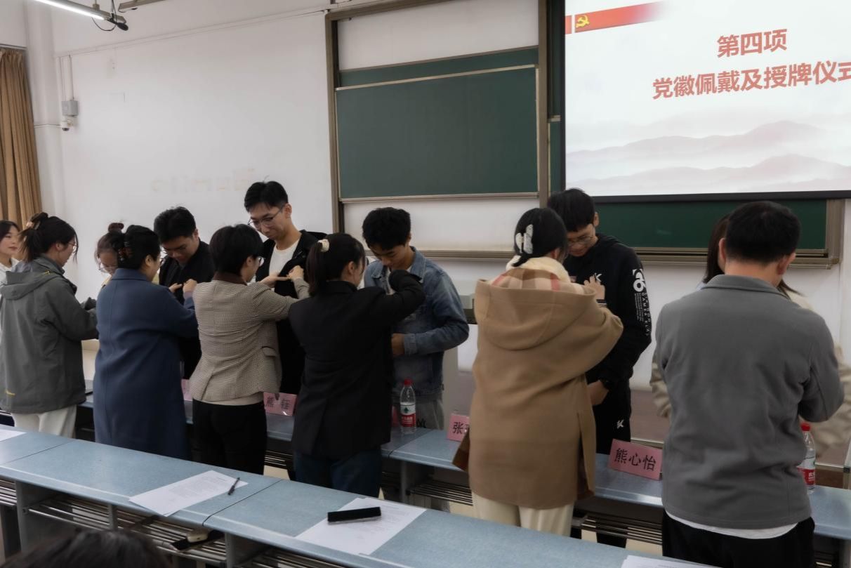 与会老师为新发展入党同志举行党徽佩戴仪式,并分组为员工党员宿舍授牌。老师们嘱托各位同志时刻牢记党员身份,做好表率,在服务师生中践行入党初心。