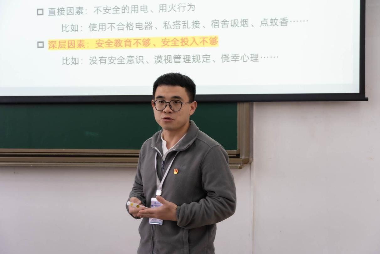 郑纪伟老师为大家进行宿舍安全教育。他讲述了宿舍消防安全的重大意义、风险因素,指出当前同学们消防安全意识不足,用电、用火行为不规范的问题较为突出,希望员工党员在宿舍消防安全工作中发挥其先锋模范作用,在具体实践中锤炼党性修养。