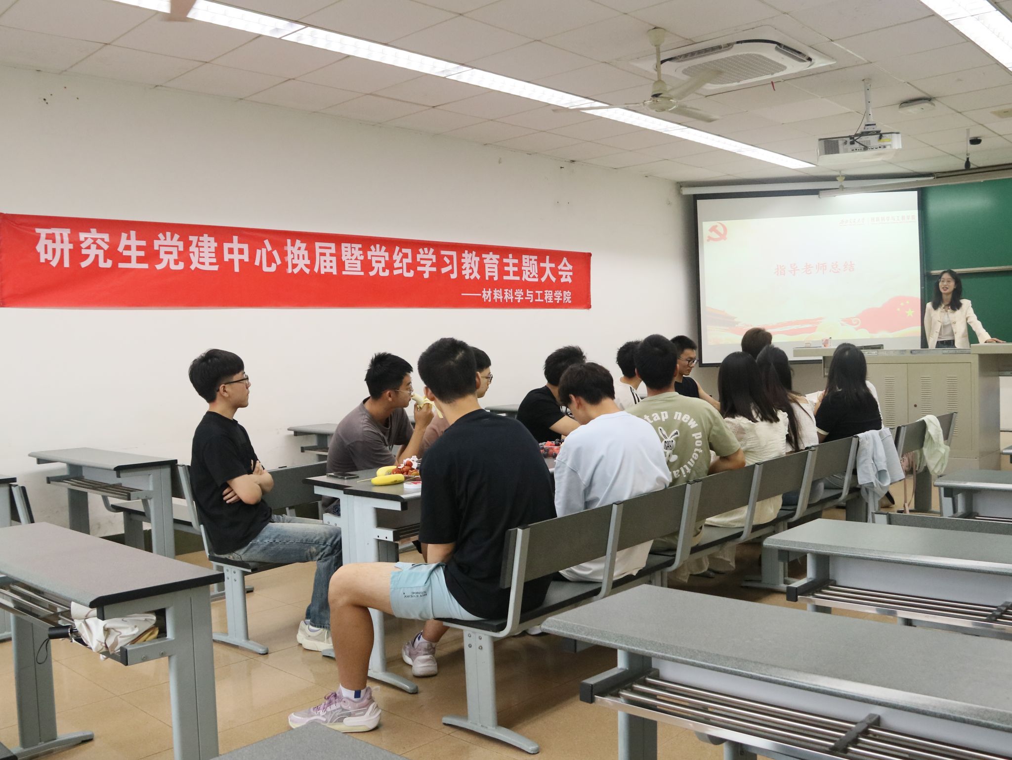 研究生党建中心现任主任以及各部门部长全面回顾了过去一年的工作历程,总结工作经验和教训,并对中心工作提出了建议。鼓励同学们积极参与党建中心的工作,在实践中认识到自己的责任和使命,培养责任意识和奉献精神。