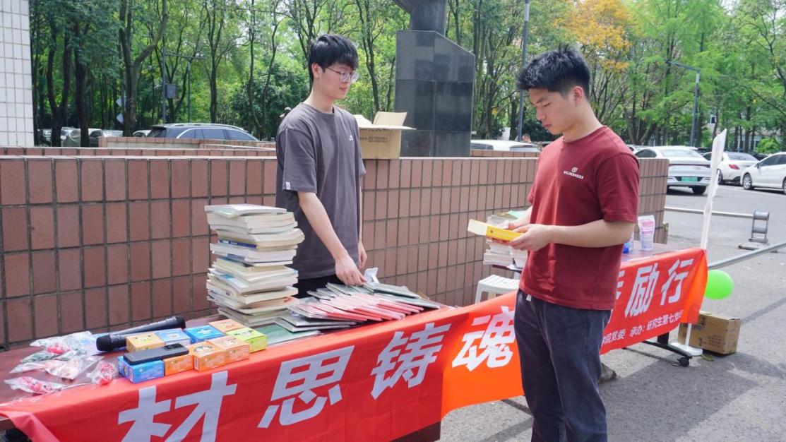 同时,旧书换礼活动也进行得如火如荼。在党员志愿者引导下,参与师生有序完成书籍分类、换书登记,兑换礼品。截止下午4点活动结束,成功回收专业教材、文学读物等一百余本。这场充满温度的书香接力,既是对绿色发展观的有力践行,更展现出新时代青年知行合一的公益担当,让每一册流转的书籍都成为丈量社会责任的精神坐标。
