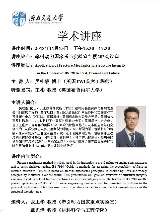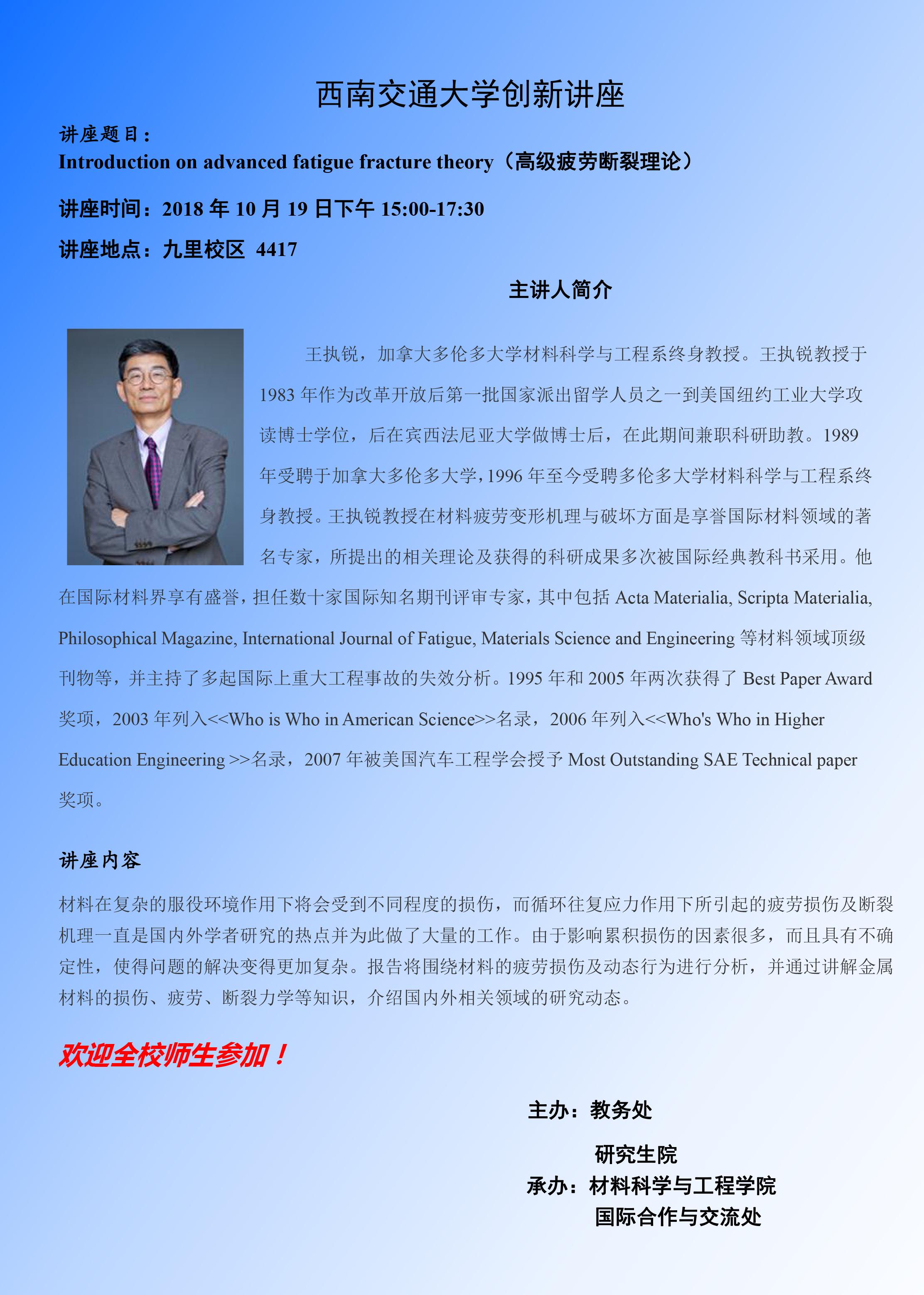 讲座题目:Introduction on advanced fatigue fracture theory(高级疲...